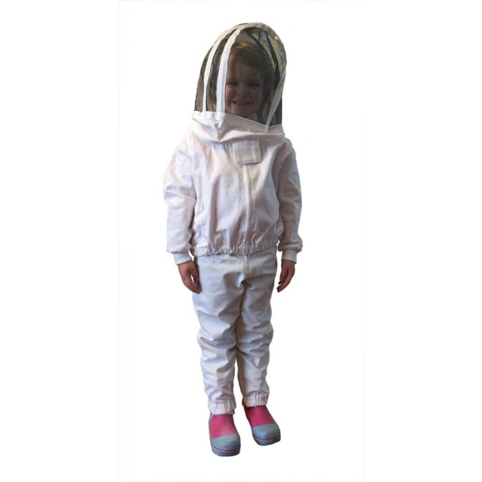 Child’s Economy Two Piece Suit- Age 4 features half zip hooded veil with elastic at the waist and wrists. The trousers feature elastic waist and ankles along with two front pockets. Perfect for your child’s first visit to the bee yard. Jacket Size : Neck 21 inches – Shoulder Width 15 inches – Arm Length 14 inches – Chest 38 inches – Waist 19 inches – Expanded Waist 23 inches – Pants – Hips 28 inches – Leg inseam 16 1/2 inches, Pant Waist 19 inches, Pant Expanded Waist 23 inches