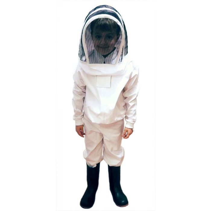 Childs Economy Two Piece Suit – Age 6.  Jacket features half zip hooded veil with elastic at the waist and wrists. The trousers feature elastic waist and ankles along with two front pockets. Perfect for your child’s first visit to the bee yard. Sizes: neck – 25, shoulder – 16.5, arm – 19, chest – 39, waist – 19, fully expanded waist – 25, pelvis – 30, hips – 32, leg inseam – 18