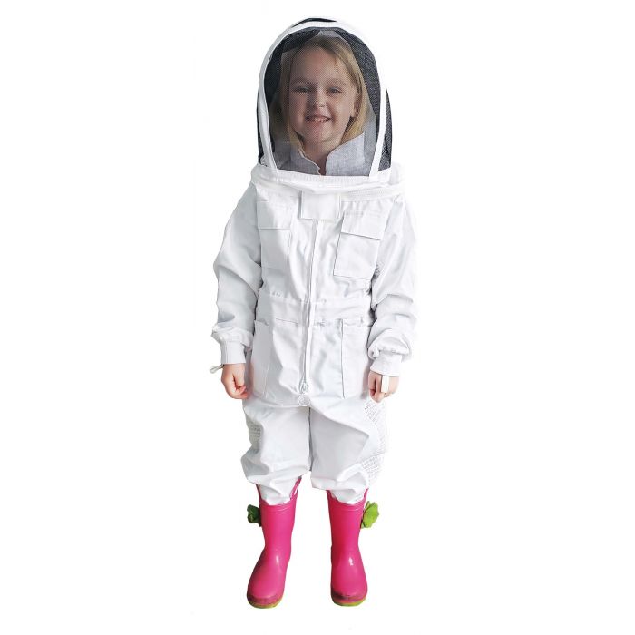 Childs Ventilated Bee Suit Ages 4-6 years old. We are pleased to be the first to offer a partially ventilated suit. The ventilation areas are located along your sides running from your waistline to your wrist in the suit. The full suit is ventilated on the outside of the legs starting at the ankles and ending at the wrist. The hood is fully ventilated on the suit and optimum air flow in the right places make this perfect for your trips into the bee yard.